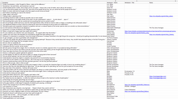 Quotations – My oldest spreadsheet. When I head a good quote, I enter it for later use. I’m now up to 480 lines: