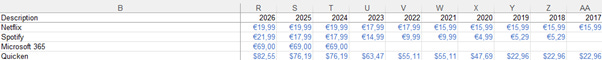 Subscriptions – Track all those media and software, memberships, charitable donations, licenses and permits. It’s eye-opening, especially to annualize monthlies, and the other way ‘round. Once a time series forms, it also shows how we’re slowly being squeezed:
