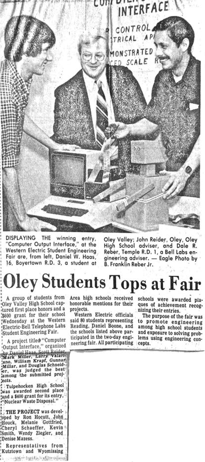 On one of my trips back home to Pennsylvania last year, I was pawing through some of my old high school papers, and (amongst some other ones https://gunnarmiller.substack.com/p/ye-olde-memes ) and found the submission a team of us made to the 1982 Western Electric Engineering Fair https://1drv.ms/b/c/5ed4c22a9f7768df/IQDfaHefKsLUIIBeEmQDAAAAARLt-wn2gZzCAQ19KLvO7o8?e=p2w3eI.