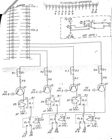 Rather than using expensive peripheral cards, we discovered a clever backdoor: The Apple’s game controller I/O port had four software-controllable annunciator outputs that could be toggled with simple PEEK and POKE commands in Applesoft BASIC. We designed and built a relay driver circuit around 2N2219 NPN transistors and 1N914 switching diodes to buffer the tiny TTL signal from the annunciators and trigger six-volt relay switches.